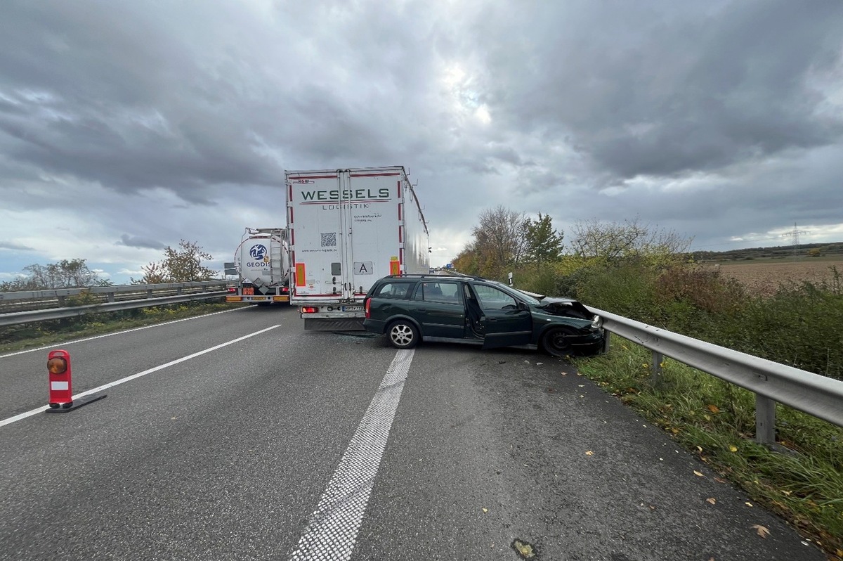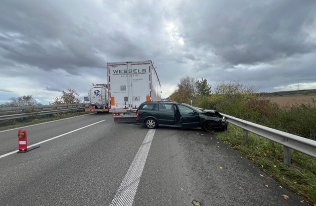 Ein 56-jähriger Opel-Astra-Fahrer befuhr gestern Mittag, 23.10.2026, gegen 13.10 Uhr, die A65 in Richtung Karlsruhe auf dem rechten Fahrstreifen. Zwischen Landau-Zentrum und Landau-Süd übersah er einen im Stauende stehenden LKW und wich daher auf den linken Fahrstreifen aus. Hierbei verlor er die Kontrolle über sein Fahrzeug und stieß zunächst gegen die Mittelleitplanke. Danach übersteuerte er den PKW, kollidierte mit einem auf dem rechten Fahrstreifen stehenden LKW-Auflieger und schlug dann noch in die rechte Schutzplanke ein, wo er zum Stehen kam. Dabei zog er sich leichte Verletzungen zu und wurde in ein Krankenhaus eingeliefert. Bei der Unfallaufnahme ergaben sich Hinweise auf Alkoholkonsum, was ein anschließender Test mit dem Ergebnis 1,06 Promille bestätigte. Ihm wurde eine Blutprobe entnommen und sein Führerschein wurde sichergestellt. Am PKW entstand Totalschaden. Der rechte Fahrstreifen musste während der Unfallaufnahme gesperrt werden.