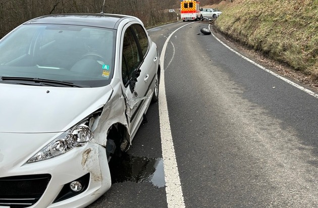 Am 26.01.26, gegen 10.30 Uhr, befuhr eine 19-jährige PKW Fahrerin die B 48,Wellbachtal, in Richtung Johanniskreuz. In einer Rechtskurve kam sie auf die Gegenfahrbahn. Trotz Gegenlenken konnte sie einen Zusammenstoß mit einem 69-jährigen, entgegenkommenden PKW Fahrer, nicht verhindern. Die Autos stießen seitlich zusammen, wobei bei dem einen PKW das Vorderrad abgerissen wurde. Die Verursacherin schlitterte weiter und fuhr mit der Front in den Hang. Bei ihr wurde der Hinterreifen aus der Karosserie gerissen, sie wurde mit leichten Verletzungen in ein Krankenhaus gebracht. Die anderen Beteiligten blieben unverletzt. Es entstand an beiden PKW wirtschaftlicher Totalschaden von ca. 45.000 EUR. Die PKW mussten abgeschleppt und die Fahrbahn gereinigt werden.