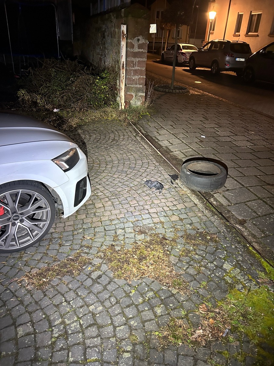 Beim Verlassen eines Parkplatzes in der Königstraße, am 31.01.2026 gegen 21:15 Uhr, überführ ein 37-jähriger Fahrzeugführer aus dem Kreis Germersheim einen in der Ausfahrt abgelegten Altreifen. Es ist davon auszugehen, dass der auf einer Stahlfelge aufgezogene Reifen zuvor absichtlich dort platziert wurde. Durch den Unfall entstand am PKW ein Schaden von ca. 3000 Euro.