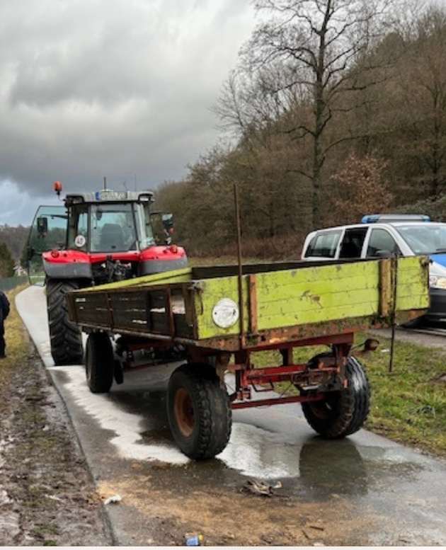 Am 12.02.26, gegen 13.50 Uhr, meldete sich der Fahrer eines Traktors, der unterwegs mit Weinbergpfählen war, die er zur Altmetallentsorgung nach Annweiler fahren wollte, diese waren auf einem Anhänger geladen. Auf der B48, zw. Abfahrt Wernersberg und Annweiler, löste sich die Gelenkwelle vom linken Vorderrad des Anhängers, hierdurch riss die Hydraulikwelle zwischen Zugfahrzeug und Anhänger und mehrere Liter Hydrauliköl flossen auf die B48 und den danebenliegenden Fahrradweg. Da nicht ausgeschlossen werden konnte, ob Öl ins Erdreich sickerte, wurde die Untere Wasserbehörde verständigt. Die Fahrbahn musste durch eine Spezialfirma gereinigt werden. Weiter konnte festgestellt werden, dass der Anhänger ohne gültiges Kennzeichen geführt wurde. Neben den erheblichen Kosten für die Reinigung der Fahrbahn, wurde eine Anzeige wegen des Verstoßes gegen das Pfichtversicherungs-und Kraftfahrzeugsteuergesetzes eingeleitet.