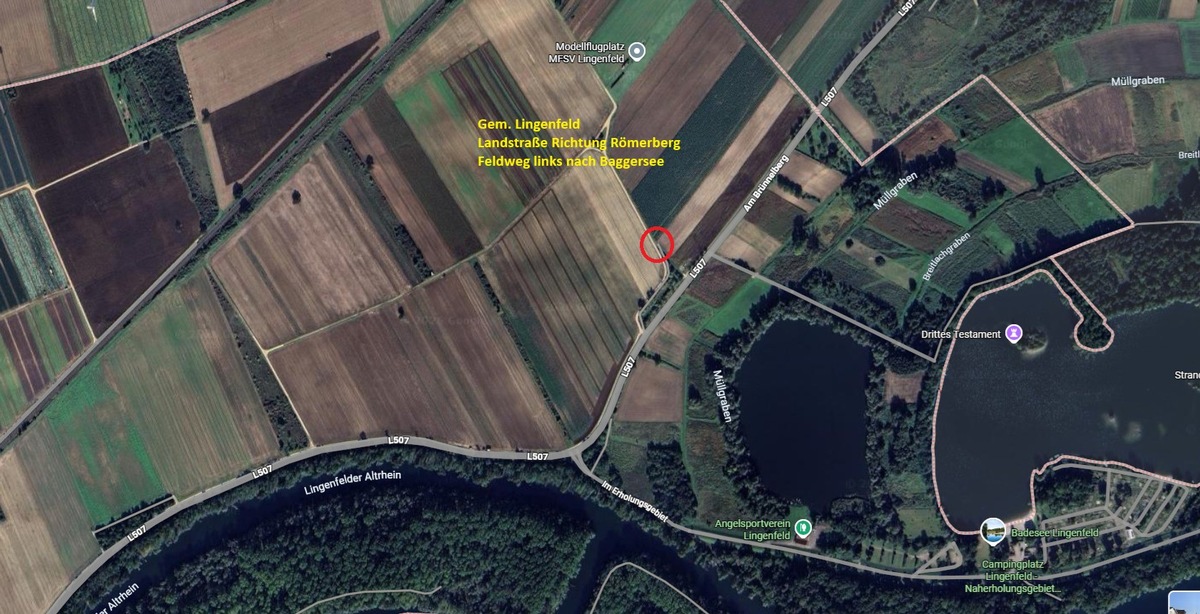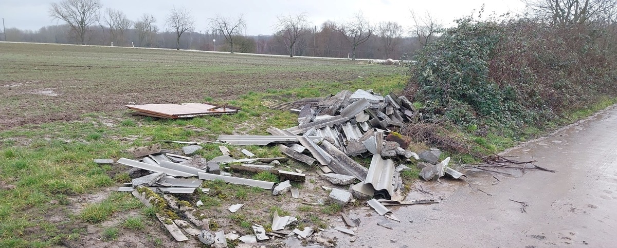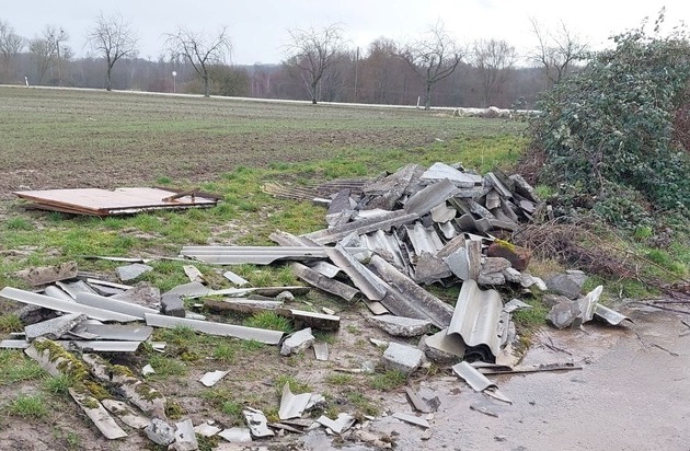 Im Zeitraum von Freitag, dem 13.02.2026, auf Sonntag, dem 16.02.2026, kam es auf offenem Feld zwischen Lingenfeld und Römerberg, in unmittelbarer Nähe der Landstraße 507, zu einem Fall des unerlaubten Umgangs mit Abfällen. Bislang unbekannte Täter entsorgten im genannten Zeitraum auf einem Feldweg gegenüber des Badesees Lingenfeld illegal eine größere Menge Bauschutt, darunter auch Eternitplatten.