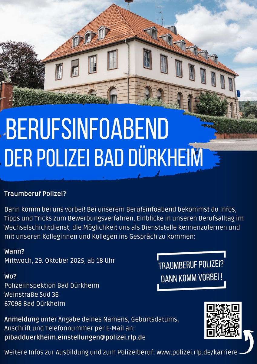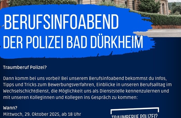 Am Mittwoch, 29.10.2025 lädt die Polizeiinspektion Bad Dürkheim wieder zu einem Berufsinformationsabend ein. Ab 18:00 Uhr haben Jugendliche ab 15 Jahren und deren Eltern erneut die Möglichkeit, sich über die Karrieremöglichkeiten bei der Polizei Rheinland-Pfalz zu informieren.