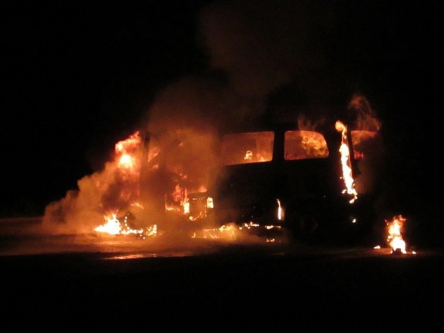 Heute Morgen, gegen 06.28 Uhr brannte in der Bahnhofstraße ein Mercedes Vito völlig aus, nachdem dieser kurz zuvor geführt wurde, um Mitarbeiter einer Firma aus Ludwigshafen in einer nahe gelegenen Firma in der Bahnhofstraße abzusetzen. Glücklicherweise begann das ursprünglich fast voll besetzte Fahrzeug erst an zu brennen, nachdem der Fahrer und seine fünf Mitfahrer das Fahrzeug verlassen hatten. Die Feuerwehr hatte den Brand gelöscht. Nach bisherigen Erkenntnissen ist von einem technischen Defekt auszugehen. Der Sachschaden beträgt ca. 30000,-EUR.