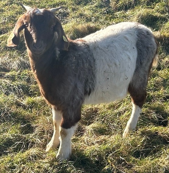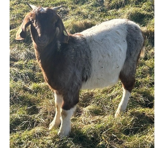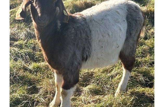 Bei dem entwendeten Tier handelt es sich um einen Mischling aus Burenziege und Kalahari Red. Das Tier weist eine braun-weiße Färbung auf und trägt eine Ohrmarke mit der Nummer 38536. Ein Bild des Geschwistertiers ist zum Abgleich beigefügt.