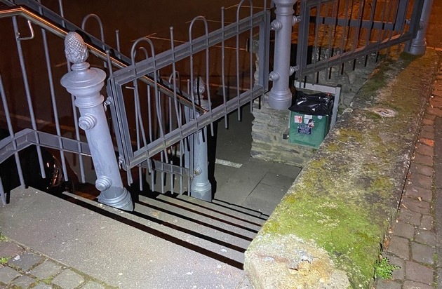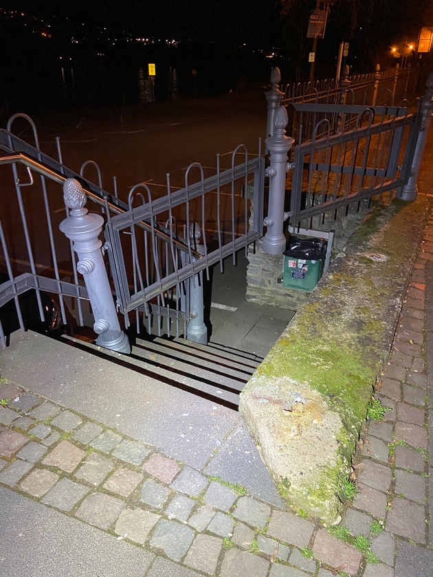Ebenfalls am Freitagnachmittag/ -abend geriet ein bisher unbekanntes Fahrzeug im Bereich des Bernkasteler "Gestades", Höhe Hausnummer 1, stadteinwärts von Graach kommend, gegen das dort befindliche massive Geländer, welches den Gehweg am Gestade vom Moselparkplatz absichert. Hierbei wurde ein Teilstück des Geländers massiv verschoben. Aufgrund der Spurenlage könnte es sich bei dem Verursacher um einen LKW oder Transporter gehandelt haben. Der Unfallzeitpunkt dürfte zwischen 17:00 Uhr und 20:00 Uhr liegen. Hinweise auf den noch unbekannten Verursacher der Fahrerflucht nimmt die Polizei Bernkastel-Kues entgegen.