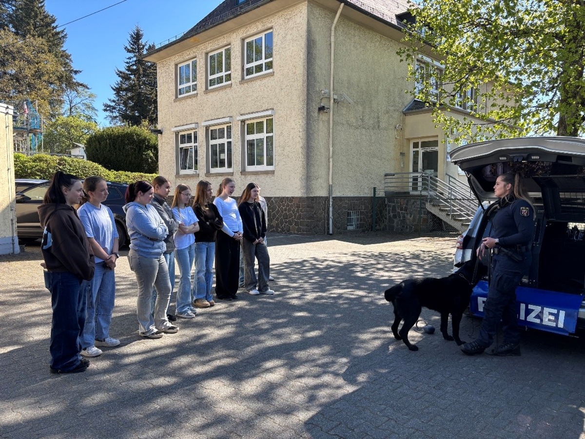 Zehn Mädchen im Alter von 13-14 Jahren nutzten den diesjährigen Girl's Day, um sich bei der PI Baumholder über den Polizeiberuf zu informieren. Hautnah erlebten sie Theorie und Praxis und erhielten in Gesprächen Einblicke aus persönlichen Erfahrungen rund um den Beruf der Polizistin. Nach der Begrüßung wurde zunächst die Vielfalt des Polizeiberufs dargestellt. Daneben wurde ihnen die persönliche Ausrüstung in allen Facetten der täglichen Arbeit gezeigt und sie erhielten die Möglichkeit, diese einmal anzuprobieren, bzw. sich näher anzuschauen. Danach konnte die Dienststelle besichtigt werden - und auch der Zellentrakt war davon nicht ausgenommen. Natürlich durfte auch die Besichtigung eines Streifenwagens nicht fehlen. Bei schönem Wetter erfolgte ein kleiner Einblick in das Berufsleben einer Diensthundeführerin. Durch Annika Stroh mit ihrem Diensthund, einem schwarzen Schäferhund, der auf den Namen "Ares" hört, konnten die Mädchen erleben, wie ein Diensthund als Schutzhund agiert und auch Sprengstoff aufspüren kann. Durch KHK Schübelin erfolgte die Vorstellung des Tätigkeitsfeldes "Kriminalpolizei", was er sehr anschaulich und kurzweilig übermittelte. Zum Abschluss erfolgte noch ein Spiel bei dem die Mädchen einen Verdächtigen überführen mussten - initiiert von PK Becker. Alle Mädchen gaben die Rückmeldung, dass es sich um eine gelungene Veranstaltung gehandelt hat und sie sich vorstellen könnten, den Beruf später auch zu ergreifen.