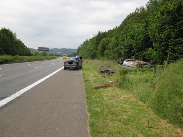 Am Samstag, 11.06.2016, wurde eine Zivilstreife der Polizeiinspektion Wittlich gegen 06.25 Uhr im Rahmen einer Verkehrskontrolle in Binsfeld auf einen Golf 3 mit WND-Kennzeichen samt Anhänger aufmerksam. Beim Versuch das Fahrzeug anzuhalten, flüchtete der Fahrer in Richtung Niederkail und Arenrath. Hierbei benutzte er auch Feld- und Waldwege. Von Arenrath aus ging die Flucht weiter über die L 50 durch die Ortslage Dreis. Dort rammte der Flüchtige einen Funkstreifenwagen und das Zivilfahrzeug, weiterhin wurde eine Hauswand leicht beschädigt. Weiter ging die Verfolgungsfahrt über die L 141 und die L 47 in Fahrtrichtung Autobahn A 1, auf die der Flüchtige in Fahrtrichtung Saarbrücken einfuhr. Alle weiteren Anhalteversuche auf der Autobahn verliefen ebenfalls erfolglos. Hierbei beschädigte der flüchtende Autofahrer zwei weitere Funkstreifenwagen. Kurz hinter dem Autobahndreieck Moseltal rammte der Fahrer des VW Golf einen weiteren Zivilwagen der Polizei. Dabei verlor er die Kontrolle über sein Fahrzeug und überschlug sich in der angrenzenden Böschung. Der unfallflüchtige Fahrer, ein 28-jähriger Mann aus dem Kreis St. Wendel, wurde leicht verletzt. Der Führerschein des Flüchtigen wurde beschlagnahmt, ihm wurde eine Blutprobe entnommen.