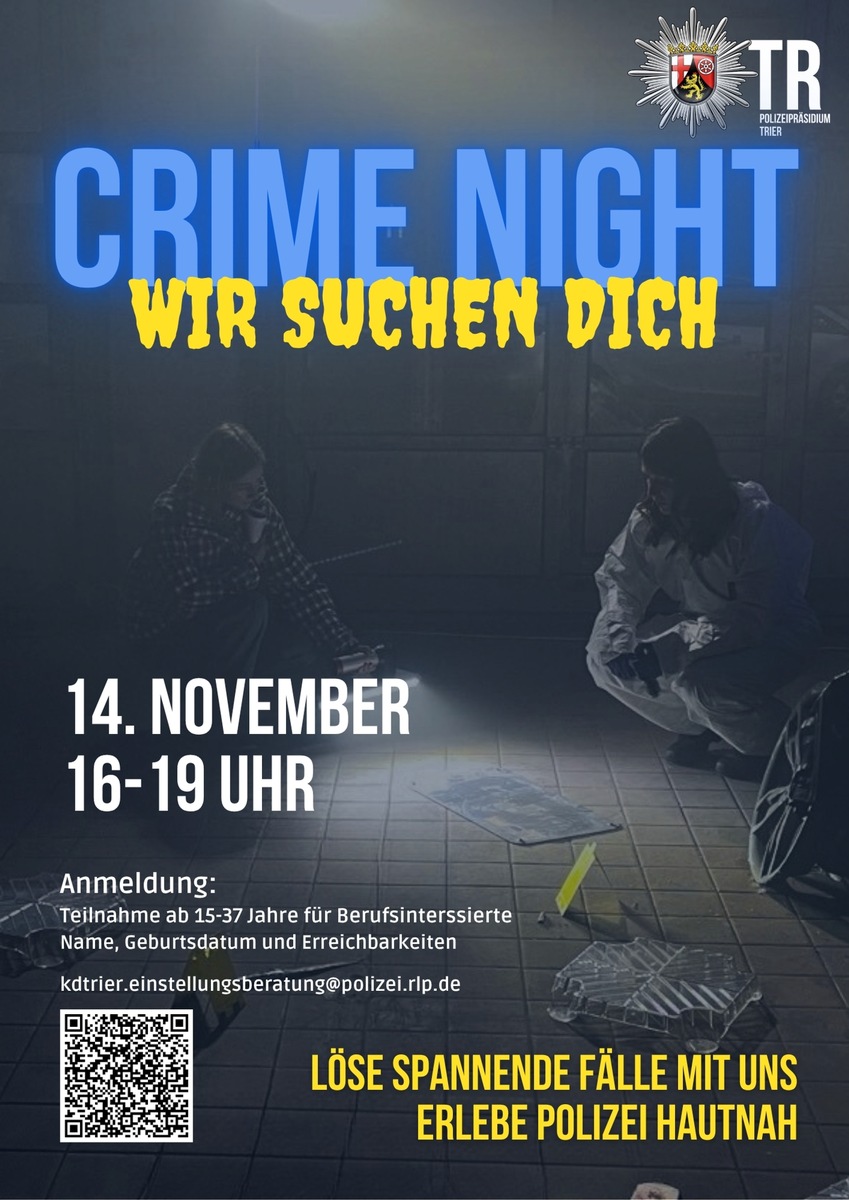 Die zweite landesweite Crime Night startet am Freitag, den 14. November, im Zeitraum von 16 bis 19 Uhr in der Kürenzer Straße 3 in Trier. Es erwarten dich mehrere spannende Stationen, an denen du selbst tätig werden darfst und zudem fesselnde Einblicke in die Arbeit der Kriminalpolizei und der Schutzpolizei.
