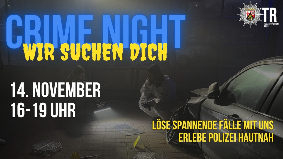 Du hast Lust auf echte Polizeiarbeit? Dann komm zur Crime Night 2.0! Am Freitag, den 14. November, zwischen 16 und 19 Uhr, startet die zweite landesweite Crime Night in der Kürenzer Straße 3 in Trier.
