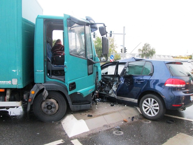 Der erste Unfall ereignete sich um 06.55 Uhr, als ein 71-jähriger LKW-Fahrer zunächst aus dem Rheingewannweg, nach rechts in die Mainzer Straße, Richtung Mainz abbiegen wollte und sich dann entschied, geradeaus über die Kreuzung in Richtung Fahrweg zu steuern. An dieser Stelle galt das grüne Licht der Ampel eben nur für Rechtsabbieger, der Verkehr geradeaus hatte "rot". Der Fahrer des LKW übersah dabei die 29-jährige Golf-Fahrerin, die die Mainzer Straße aus Mainz kommend befuhr, rammte den Golf in Höhe der Fahrertür und schob diesen auf die Verkehrsinsel. Durch die Wucht des Aufpralls, wurde die Fahrerin verletzt und musste ärztlich versorgt werden. An beiden Fahrzeugen entstand erheblicher Sachschaden, sie mussten abgeschleppt werden.