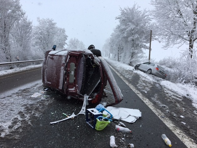 Am Samstag, 31.12.2016, befährt eine 49jährige Pkw-Fahrerin die B9 aus Richtung Mainz kommend in Richtung Worms. Kurz vor der Einmündung Richtung Osthofen gerät der Pkw aufgrund Straßenglätte ins Schleudern und kollidiert mit einem entgegenkommenden Pkw. Die Unfallverursacherin sowie die 53jährige Fahrerin und der 55jährige Beifahrer des beteiligten Pkw klagen über Schmerzen im Halsbereich und werden vorsorglich ins Klinikum Worms verbracht. An beiden Pkw entsteht Totalschaden in Höhe von ca. 20.000,- Euro.