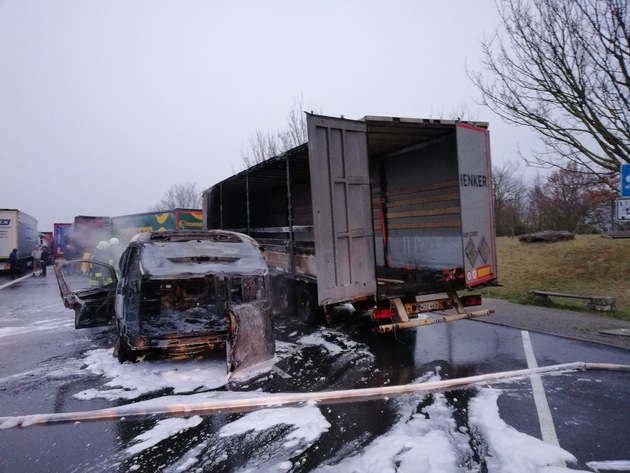 Ein 61-jähriger PKW Fahrer aus dem Saarland bemerkte, dass es während der Fahrt auf der A63 von KL Richtung MZ kurz vor dem Parkplatz Heubergerhof aus bislang ungeklärter Ursache aus dem Motorraum seines Fahrzeuges qualmt. Er fährt auf den Parkplatz und stellt dort das Fahrzeug neben einem geparkten Sattelzug ab. Dessen Fahrer bemerkt ebenfalls das qualmende Fahrzeug, nimmt einen Feuerlöscher aus seinem Führerhaus und versuchte noch vergeblich mit diesem den bereits beginnenden Brand im Motorraum des PKW zu löschen. Nachdem dies misslingt koppelt der LKW-Fahrer geistesgegenwärtig die Zugmaschine seiner LKW-Kombination ab. Er konnte jedoch nicht verhindern, dass die hintere Beleuchtung verschmort, da der PKW in Vollbrand und bereits der leere Sattelauflieger linksseitig in Brand gerät. Der PKW brennt völlig aus. Der Fahrer kann noch wenige Gegenstände aus dem Laderaum retten. Der LKW Auflieger wird an der linken Seite komplett durch Hitzeentwicklung und Brand beschädigt. Ein gänzliches Übergreifen der Flammen auf den Auflieger kann durch die Feuerwehr unterbunden und beide Fahrzeuge gelöscht werden. Beide Fahrzeuge sind nicht mehr fahrbereit und müssen abgeschleppt und geborgen werden. Der Parkplatz wird für die Dauer der Lösch- und Bergungsarbeiten komplett gesperrt. Die Autobahnmeisterei Gau-Bickelheim kümmert sich um die Absicherung des Brandortes. Die Fahrbahn muss aufgrund des mit dem Asphalt verschmolzenen Kunststoffes abgefräst werden. Der Gesamtschaden dürfte sich auf rund 45000 Euro belaufen. Verletzt wurde glücklicherweise niemand.
