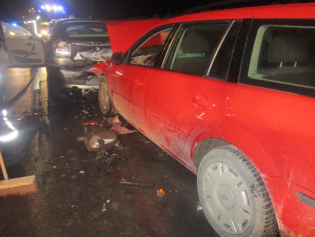 Im Rahmen der Absicherung eines liegengebliebenen PKW auf der L428, zwischen Groß-Winternheim und Schwabenheim, musste durch die eingesetzte Funkstreife der Verkehr geregelt werden, da nur noch ein Fahrstreifen der Landstraße befahrbar war. Zwei Verkehrsteilnehmer, die mit ihren Fahrzeugen aus Richtung Groß-Winterheim kamen warteten bereits am polizeilichen Anhalteposten, als am 15.10.2015 gegen 19:00 Uhr der 46jährige Ingelheimer auf den hinteren wartenden Pkw auffuhr und alle drei Fahrzeuge zusammenschob. Als Unfallursache dürfte die bei dem 46jährigen Ingelheimer festgestellte Atemalkoholkonzentration von 1,68 Promille in Frage kommen. Der Unfallverursacher musste sich im Anschluss einer Blutentnahme unterziehen und sein Führerschein wurde vorläufig entzogen. Neben erheblichem Sachschaden an allen beteiligten Fahrzeugen, wurde eine 37 jährige PKW Insassin verletzt und musste zur weiteren Behandlung in die Uni-Klinik Mainz verbracht werden.