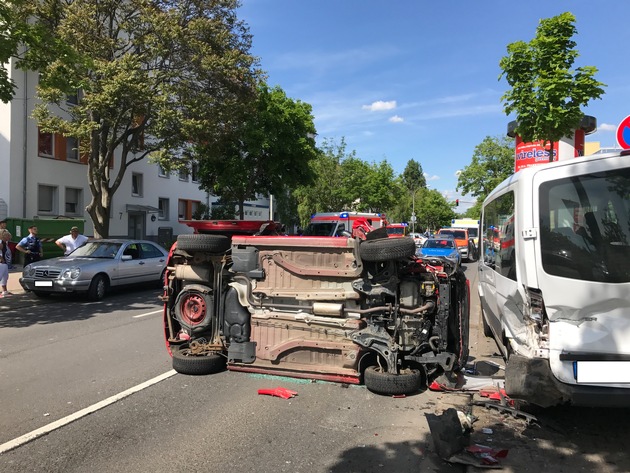 Unfall mit einer verletzten Person Ort: Mainz, Freiligrathstraße Zeit: 21.05.2017, 15.11 Uhr Ein 77-jähriger Gau-Bischofsheimer befuhr die Freiligrathstraße in Richtung Windmühlenstraße und fuhr hier zunächst den Außenspiegel eines geparkten Pkws ab. Vermutlich aufgrund dieses Unfalls und den damit verbundenen Schreck, kam er nach rechts gegen den Bordstein. Durch den Kontakt mit dem Bordstein wurde sein Fahrzeug auf die Seite geschleudert und stieß noch gegen ein weiteres geparktes Fahrzeug. Glücklicherweise wurde der 77-jährige nicht schwerverletzt und konnte mit Hilfe von herbeieilenden Passanten aus seinem Fahrzeug befreit werden. Die Freiligrathstraße ist derzeit noch für Aufräumarbeiten gesperrt. Die Aufräumarbeiten dürfte noch 1 Stunde andauern. Der Gesamtschaden wird auf 30.000 EUR geschätzt.