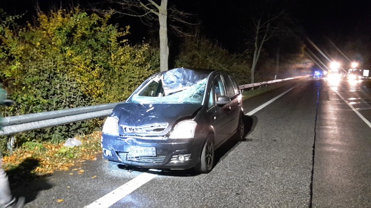 Bei einem Zusammenstoß mit einem PKW wurde am 1.11.2017 gegen 02:15 Uhr auf der B9 in Höhe der Anschlussstelle Mettenheim ein 31-Jähriger Fußgänger aus Ludwigshafen tödlich verletzt. Der 31-Jährige war aus bisher unerklärlichen Gründen zu Fuß auf der rechten der beiden Fahrspuren in Fahrtrichtung Worms unterwegs als sich von hinten ein PKW näherte. Der 19-Jährige Fahrzeugführer aus Worms nahm wahrscheinlich den 31-Jährigen zu spät wahr und erfasste ihn. Der Fußgänger erlitt tödliche Verletzungen und verstarb an der Unfallstelle. Die vier Fahrzeuginsassen des PKW, im Alter zwischen 16 und 18 Jahren, erlitten einen Schock und der Beifahrer zusätzlich Schnittverletzungen. Alle Verletzten werden in einem Krankenhaus betreut. Die Vollsperrung der B9 dauerte vier Stunden an. Ein Gutachter war vor Ort.