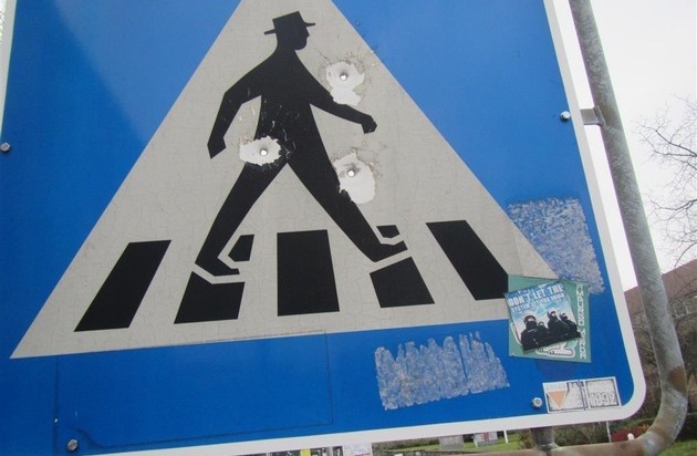 Mainz (ots) - 55128 Mainz Johann-Joachim-Becher-Weg (Fr, 15.12.2017) Durch einen unbekannten Täter wird das Verkehrszeichen "Zebrastreifen" so beschädigt, dass dort drei "Einschusslöcher" zu erkennen sind. Im näheren Umfeld können keine Hülsen oder dergleichen festgestellt werden. Wann und auch wie genau das Verkehrszeichen beschädigt wurde, ist noch Gegenstand der Ermittlungen. Hinweise bitte an die ...