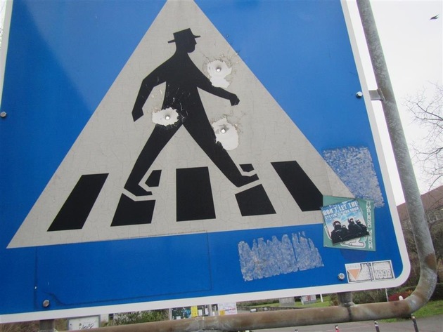 Durch einen unbekannten Täter wird das Verkehrszeichen "Zebrastreifen" so beschädigt, dass dort drei "Einschusslöcher" zu erkennen sind. Im näheren Umfeld können keine Hülsen oder dergleichen festgestellt werden. Wann und auch wie genau das Verkehrszeichen beschädigt wurde, ist noch Gegenstand der Ermittlungen. Hinweise bitte an die Polizeiinspektion Mainz 1 (Tel.: 06131 - 65 4110)