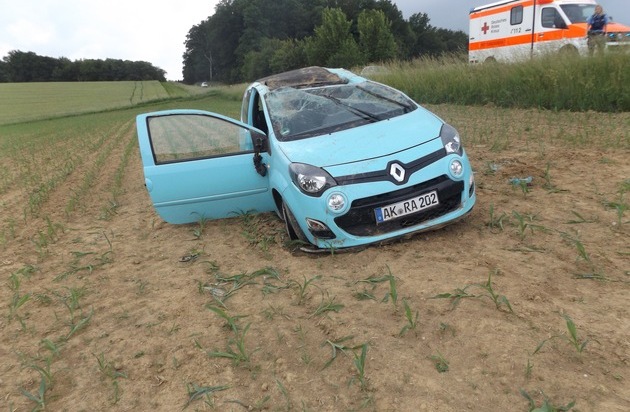 Am 31.05.2018 gegen 14.59 Uhr befuhr ein 18 - jähriger Fahrzeugführer mit seinem PKW die L 276 aus Flammersfeld kommend in Richtung Weyerbusch. Infolge Unachtsamkeit geriet er zuerst nach rechts auf den unbefestigten Randstreifen und schleuderte dann nach links auf ein Feld, wobei sich das Fahrzeug einmal überschlug. Herbei wurden er und zwei Insassen leicht verletzt und mittels RTW ins KH Altenkirchen verbracht. Schadenshöhe: 3000,-EUR.
