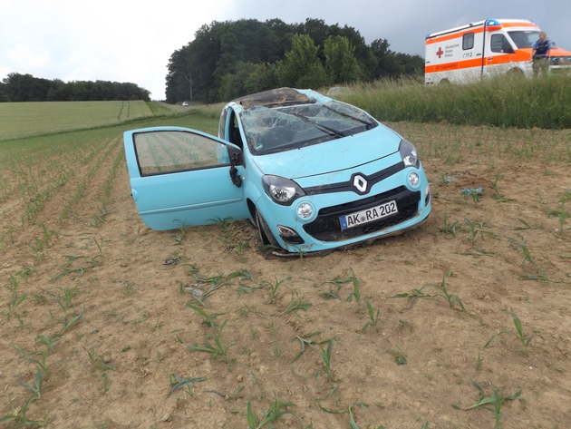 Am 31.05.2018 gegen 14.59 Uhr befuhr ein 18 - jähriger Fahrzeugführer mit seinem PKW die L 276 aus Flammersfeld kommend in Richtung Weyerbusch. Infolge Unachtsamkeit geriet er zuerst nach rechts auf den unbefestigten Randstreifen und schleuderte dann nach links auf ein Feld, wobei sich das Fahrzeug einmal überschlug. Herbei wurden er und zwei Insassen leicht verletzt und mittels RTW ins KH Altenkirchen verbracht. Schadenshöhe: 3000,-EUR.