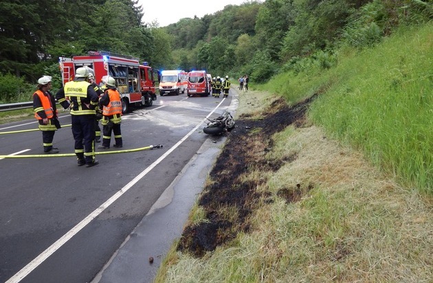 Am gestrigen Donnerstag, gegen 19:15 Uhr, befuhr eine Gruppe Motorradfahrer die Panoramastraße von Cochem in Richtung Faid. In einer langgezogenen Rechtskurve kam ein Fahrer zu Fall, rutschte über den Fahrstreifen des Gegenverkehrs und prallte gegen den Bordstein. Das Motorrad geriet in Brand und verbrannte. Auch Teile der Böschung gerieten in Brand. Der 19-jährige Fahrer und seine 18-jährige Beifahrerin (beide aus dem Rhein-Hunsrück-Kreis) erlitten leichte Verletzungen. Neben der Polizei waren Rettungsdienst, Feuerwehr und Straßenmeisterei im Einsatz.