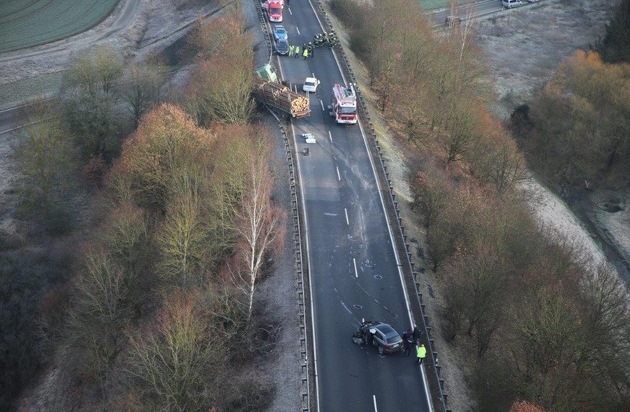 Gegen 06:00 Uhr kam es auf dem sog. Zubringer, der B 262 zwischen der A 48 (Anschlussstelle Mayen) und Mayen, zu einem folgenschweren Verkehrsunfall. Bei dem Verkehrsunfall waren zwei PKW und ein Sattelzug beteiligt. Es wurden drei Personen verletzt, eine Person davon schwer. Der Sachschaden beläuft sich auf schätzungsweise 100.000 Euro. Nach dem jetzigen Stand der Ermittlungen hatte eine 37-jährige Frau aus dem Raum Cochem-Zell mit ihrem PKW (SUV) die B 262 von Mayen in Richtung Autobahn A 48 befahren. Etwa in Höhe des Tierheimes Mayen kam die 37-jährige aus noch ungeklärter Ursache auf die Gegenfahrbahn. Ein aus Richtung A 48 entgegenkommender luxemburgischer Sattelzug wollte nach rechts bis in den Grünstreifen ausweiche, verlor jedoch dabei die Kontrolle. Der Sattelzug streifte im Anschluss den PKW (SUV) der 37-jährigen und kollidierte anschließend frontal mit einem von Mayen in Richtung A 48 fahrenden 51-jährigen PKW-Fahrer aus dem Raum Mayen. Der 51-jährige PKW-Fahrer wurde in seinem PKW eingeklemmt. Nachdem er durch die Feuerwehr aus seinem Auto befreit worden war, wurde er mit dem Rettungshubschraube in ein Koblenzer Krankenhaus geflogen. Der 38-jährige LKW-Fahrer und die 37-jährige SUV-Fahrerin wurden nach derzeitigem Stand nur leicht verletzt. Aufgrund des Unfalls musste die B 262, Zubringer zwischen Mayen und A 48 vol gesperrt werden. Die Vollsperrung dauert derzeit (10:05 Uhr) wegen der aufwendigen Bergungsarbeiten noch bis voraussichtlich 11-12 Uhr an. Die Umleitungsstrecken sind durch die Straßen- und Autobahnmeisterei ausgeschildert. Insbesondere LKW werden aufgefordert, die Unfallstelle weiträumig zu umfahren. Eingesetzt waren sechs Beamte der PI Mayen, die Feuerwehr Mayen, der Rettungshubschrauber aus Koblenz, der Rettungsdienst Mayen, die Straßen- und Autobahnmeisterei und der Polizeihubschrauber. Ein Gutachter wurde durch die Staatsanwaltschaft mit der Rekonstruktion des Unfallgeschehens beauftragt.
