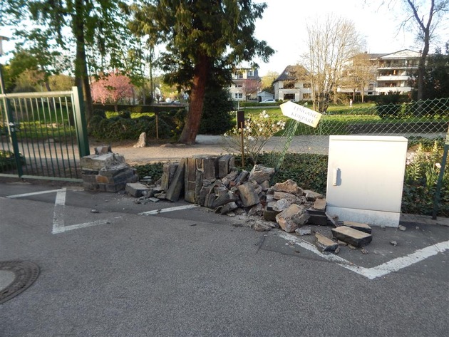 Am Dienstag, den 17.04.2018, gegen 18:50 Uhr, wurde auf der Oberstraße, Ecke Hardtstraße, nahe dem "Dorinth Parkhotel" die Mauer des Kurgartens durch einen LKW beschädigt. Der LKW-Fahrer setzte anschließend seine Fahrt fort, ohne sich um die Schadensregulierung zu kümmern. Die Natursteinmauer wurde auf einer Länge von ca. 4,5 komplett zerstört und muß neu aufgebaut werden. Die Schadenshöhe beträgt ca. 4000 EUR. Zeugen, die Hinweise zum Unfall geben können, melden sich bitte bei der Polizeiinspektion Bad Neuenahr-Ahrweiler (Tel.: 02641-9740).