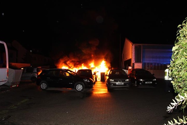 Gegen halb zwei Uhr morgens erhielt die Polizeiinspektion Andernach die Mitteilung, dass auf einem Grundstück in Weißenthurm mehrere Fahrzeuge lichterloh brennen würden. Nachdem die Feuerwehr Weißenthurm die Löscharbeiten abgeschlossen hatte, konnte festgestellt werden, dass mehrere Gebrauchtfahrzeuge einer Automobilfirma komplett ausgebrannt sind. Ein Schaden an den umliegenden Wohn- und Geschäftsgebäuden ist augenscheinlich nicht entstanden. Glücklicherweise wurde niemand verletzt. Die Ermittlungen bezüglich der Brandursache dauern an. Die genaue Schadenshöhe ist derzeit unbekannt.