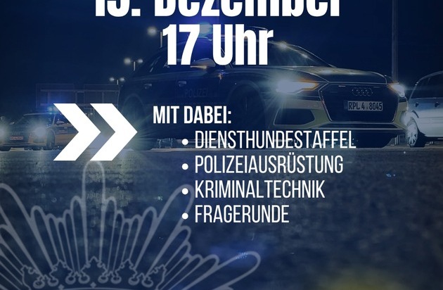 Die Polizei Andernach lädt alle, die sich für den Beruf des Polizeibeamten interessieren, am Montag, 15. Dezember 2025 ab 17:00 Uhr zu einem Berufsinfoabend ein. Hierbei können sich Interessierte über den abwechslungs- und facettenreichen Beruf, die Zugangsvoraussetzungen und das Studium zum Polizeikommissar / zur Polizeikommissarin oder zum Kriminalkommissar / zur Kriminalkommissarin informieren.