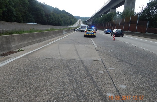 Am Samstag, den 19.08.2017, gegen 12:26 Uhr, kam es im Bereich der BAB 3, km 46,1, Talsenke des Wiedbachtales, in Fahrtrichtung Frankfurt zu einem Verkehrsunfall, an welchem ein dunkler PKW mit Stufenheck beteiligt gewesen sein soll. Dieses Fahrzeug soll vom mittleren Fahrstreifen aus nach einem Überholvorgang so dicht vor ein auf dem rechten Fahrstreifen fahrendes Wohnwagengespann eingeschert sein, das dessen Fahrer sich erschrak und abbremste. Hierbei schaukelte sich das Wohnwagengespann auf und kollidierte in der Folge mit der linken Fahrstreifenbegrenzung aus Beton. Das Gespann knickte ein und blieb zum Großteil auf dem ganz linken Fahrstreifen liegen. Für die Dauer der Unfallaufnahme bis zur Bergung mußten zwei Fahrstreifen gesperrt werden. Es kam rasch zu einem Stau von circa 5km Länge. Sachdienliche Hinweise zum flüchtigen Verursacher erbittet die Polizeiautobahnstation Montabaur. Der Gesamtschaden beläuft sich auf circa 12000 Euro