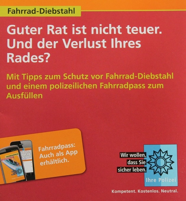 Vorteil der App: Es können alle Daten, die zur Identifizierung eines gestohlenen Fahrrads und für die Suche nach dem Eigentümer wichtig sind, problemlos gespeichert werden: die Rahmen- und Codiernummer, Angaben zu Radtyp, Hersteller und Modell, eine genaue Beschreibung des Rads sowie Fotos. Darüber hinaus lassen sich die Angaben mehrerer Räder über die App problemlos verwalten. Alle Daten können zudem ausgedruckt oder per Mail im Textformat oder als PDF-Anhang verschickt werden, zum Beispiel um sie im Notfall sofort an die Polizei beziehungsweise den Versicherer weiterleiten zu können. Und: Der Radbesitzer hat die Daten auf dem Smartphone immer dabei. Weitere Infos zu diesem Thema finden Sie unter: www.polizei-beratung.de