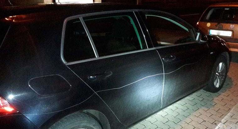 Insgesamt wurden die Außenspiegel an sechs geparkten Pkw durch Fußtritte beschädigt und teilweise die Fahrzeugseiten mit spitzen Gegenständen zerkratzt.