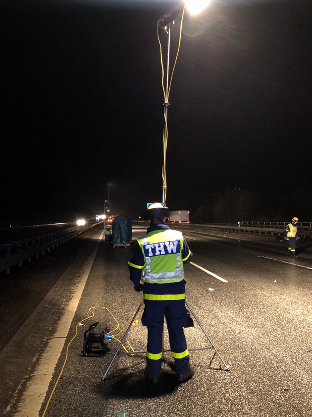 THW-HH MV SH: Nach einem schweren Verkehrsunfall auf der Autobahn 1 bei Lübeck unterstützten Einsatzkräfte des Technischen Hilfswerkes (THW) am frühen Mittwochmorgen die Polizei und leuchtete die Unfallstelle aus.