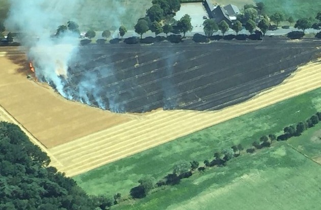 Am gestrigen Tag alarmierte um 15:30 Uhr die Leitstelle einen Löschzug der Feuerwehr Schermbeck für einen ca. 5 m² Feldbrand. Das Feuer konnte sich sehr schnell ausbreiten, sodass die ersteintreffenden Kräfte sofort die anderen Schermbecker Löschzüge (LZ Altschermbeck und LZ Gahlen) sowie ein Tanklöschfahrzeug der Feuerwehr Wesel nachalarmieren ließen. Letzendlich brannten ca. 5,5 ha. Aufgrund der starken Rauchentwicklung über der Weseler Str. (B 58) und aus Sicherheitsgründen für die eingesetzten Kräfte wurde die B 58 durch die Polizeibeamten in beide Richtungen gesperrt. Ein helfender Landwirt zog mit seinem Trecker eine Schneise um das Feuer, damit sich das Feuer nicht weiter ausbreiten konnte. Mit C-Rohren wurde das brennende Getreidefeld sodann gelöscht.