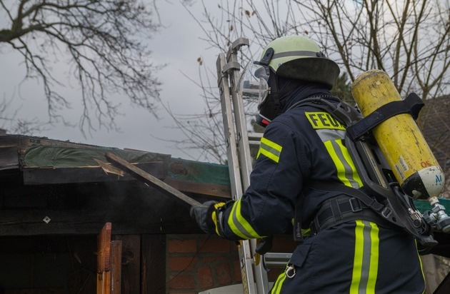 Aufmerksame Nachbarn bemerkten am Sonntagnachmittag den Brand einer Gartenhütte in Halingen. Umgehend verständigten sie die Feuerwehr und unternahmen erste Löschversuche mit einem Gartenschlauch. Durch dieses beherzte Eingreifen konnte der Brand fast vollständig gelöscht und Schlimmeres verhindert werden. Die Feuerwehr Menden, welche mit einem Löschfahrzeug nach Halingen geeilt war, brauchte nur noch Nachlöscharbeiten durchführen. Hierfür war es notwendig die Holzverkleidung im Wand- und Dachbereich zu öffnen, um alle Glutnester zu erreichen.