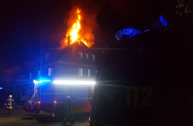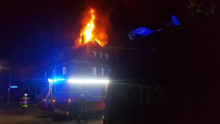 Bei Ankunft der ersten Einsatzkräfte stand der Dachstuhl eines Mehrfamilienhauses im Kreuzungsbereich Auguststraße / Stuckengründe in voller Ausdehnung in Brand. Die zwei anwesenden Mietparteien der Wohnungen im ersten Obergeschoss und der Dachgeschosswohnung konnten sich noch vor Ankunft der Feuerwehr selbst aus dem Haus retten. Sie wurden (zwei weibliche Personen und zwei männliche Personen) rettungsdienstlich untersucht, bedurften aber keiner weiteren Behandlung. Der Bewohner der Wohnung im Erdgeschoss war zum Brandzeitpunkt nicht anwesend.