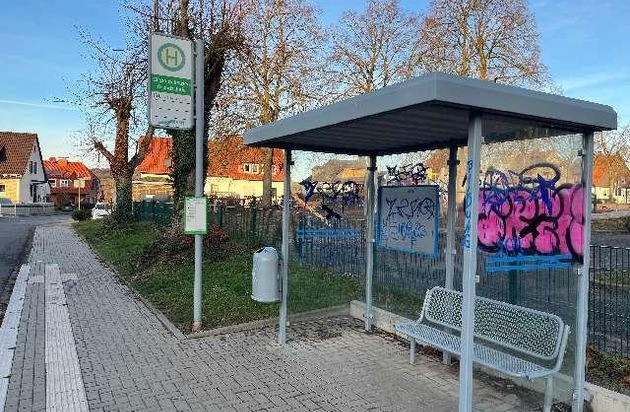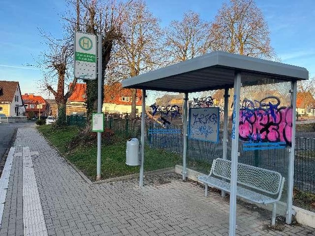 Betroffen war diesmal die Bushaltestelle an der St.-Laurentius-Straße / Schulstraße. Auf den der Polizei vorliegenden Fotos sind mehrere Schriftzüge in blauer, schwarzer und pinker Farbe zu erkennen, darunter "TREK", "161", "ZERO", "JORK", "BILDUNG", "1213" sowie "FCK NZS". Bereits in den vergangenen Wochen war es im Nahbereich zu ähnlichen Farbschmierereien gekommen.