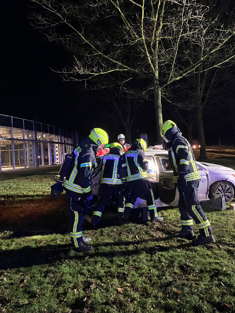 Beim Eintreffen der ersten Rettungskräfte hatte sich eine Person bereits selbstständig aus dem PKW befreit. Eine zweite Person befand sich noch im Fahrzeug und konnte dieses aufgrund der Unfallkinematik nicht eigenständig verlassen.