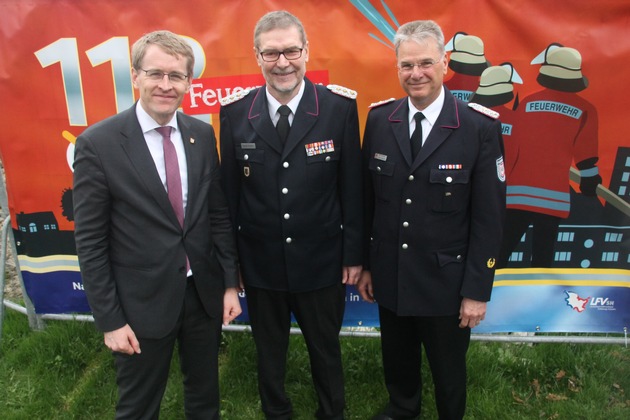 Ein Foto in der Anlage: Ministerrpräsident Daniel Günther und der scheidende Landesbrandmeister Detlef Radtke und der Nachfolger Frank Homrich.
