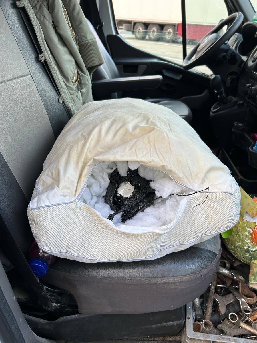 Da der komplette Laderaum mit unterschiedlichen Waren, Tüten und Koffern beladen war, wurde Rauschgiftspürhündin "Skadi" zur Unterstützung eingesetzt. In der Fahrerkabine zeigte "Skadi" an einem Kissen den Geruch von Betäubungsmitteln an. Nach Inaugenscheinnahme des Kissens kamen zwei schwarze Folienbeutel zum Vorschein. In einem der beiden Beutel wurden 216 Gramm Marihuana festgestellt und in dem anderen 233 Gramm Kokain, 99 Ecstasy Tabletten sowie 124 Gramm flüssiges Amphetamin.