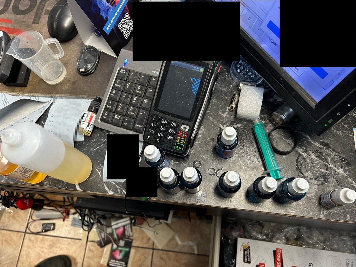 Bei einer Kontrolle eines Verkaufsgeschäfts für Tabakwaren in Braunschweig am Vormittag des 17.12.2025 hat die Kontrolleinheit Verkehrswege Göttingen des Hauptzollamts Braunschweig fast 50 Liter unversteuertes Liquid für E-Zigaretten ohne Steuerzeichen (sogenannte Steuerbanderolen) festgestellt. Außerdem wurden 83 weitere leere Behältnisse sichergestellt, die ebenfalls zur Befüllung von unversteuertem Liquid aufgemacht waren. Diese teilweise handschriftlich beschrifteten Behältnisse sowie weiteres Material, wie Dosierspritzen, lies die Zöllner annehmen, dass hier nicht nur illegal Tabakwaren vertrieben, sondern auch hergestellt wurden.