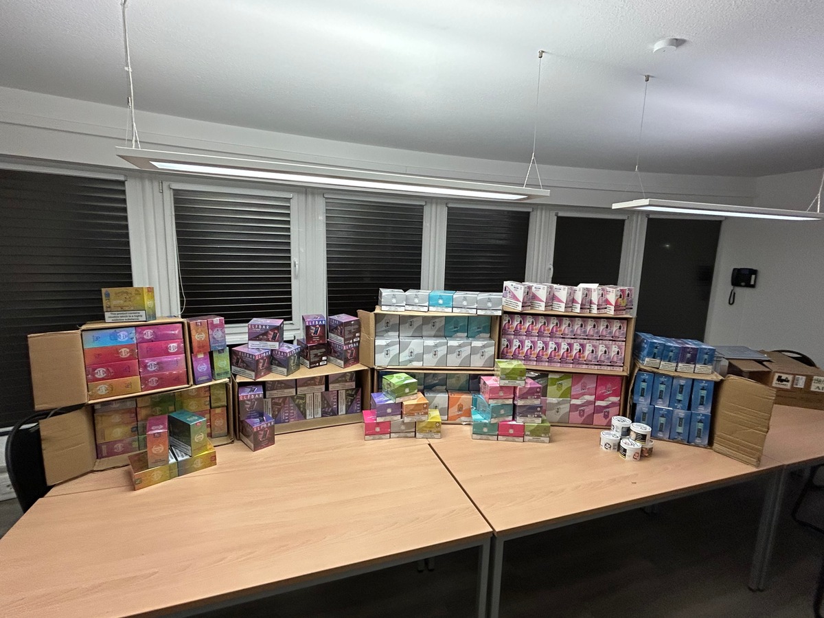 Weitere in der Garage aufgefundene Waren, darunter Nikotinprodukte und verbotene Vapes, wurden durch die Polizei in eigener Zuständigkeit sichergestellt.