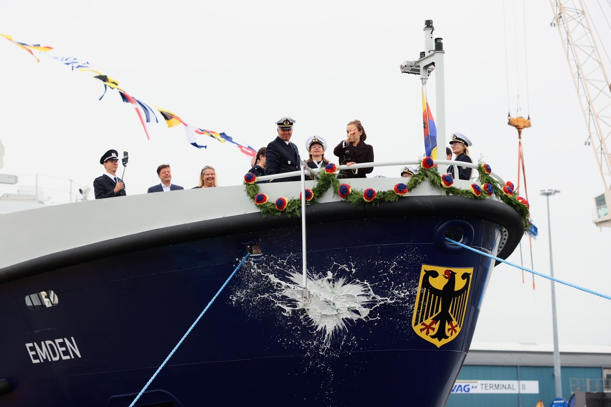 Als Taufpatin der "Emden" fungierte Nancy Böhning (Staatsrätin als Bevollmächtigte der Freien Hansestadt Bremen beim Bund und für Europa), die dem Schiff in maritimer Tradition den Namen verlieh und "allzeit gute Fahrt und immer eine Handbreit Wasser unter dem Kiel" wünschte.