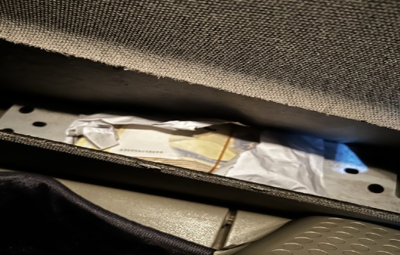 Einem untrüglichen Instinkt folgend, fanden die Beamten 200 Stück Banknoten zu je 200 Euro in unbeschrifteten Briefumschlägen in der Fahrzeugkabine eines türkischen LKW. Um an die Briefumschläge zu gelangen, musste sogar ein original vorhandenes Ablagefach in Höhe des Schlafbereiches aus der Seitenverkleidung entfernt werden.