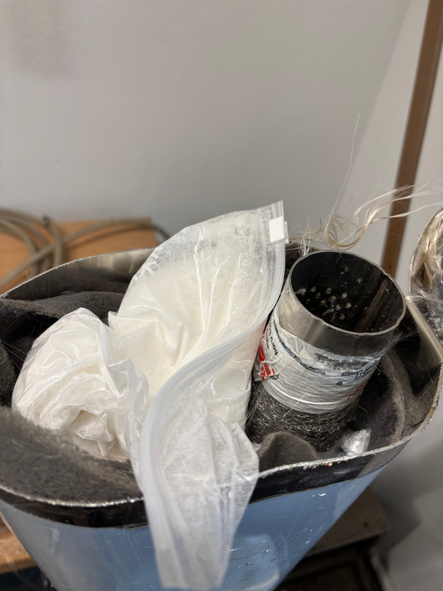 Ein Röntgenbild der ausgepackten Auspuffanlagen bestätigte die vorherige zuverlässige Spürarbeit von Vroni. Im Inneren der Metallgegenstände waren klare Auffälligkeiten erkennbar und nach dem Aufsägen kamen Beutel mit weißem kristallinem Pulver zum Vorschein.