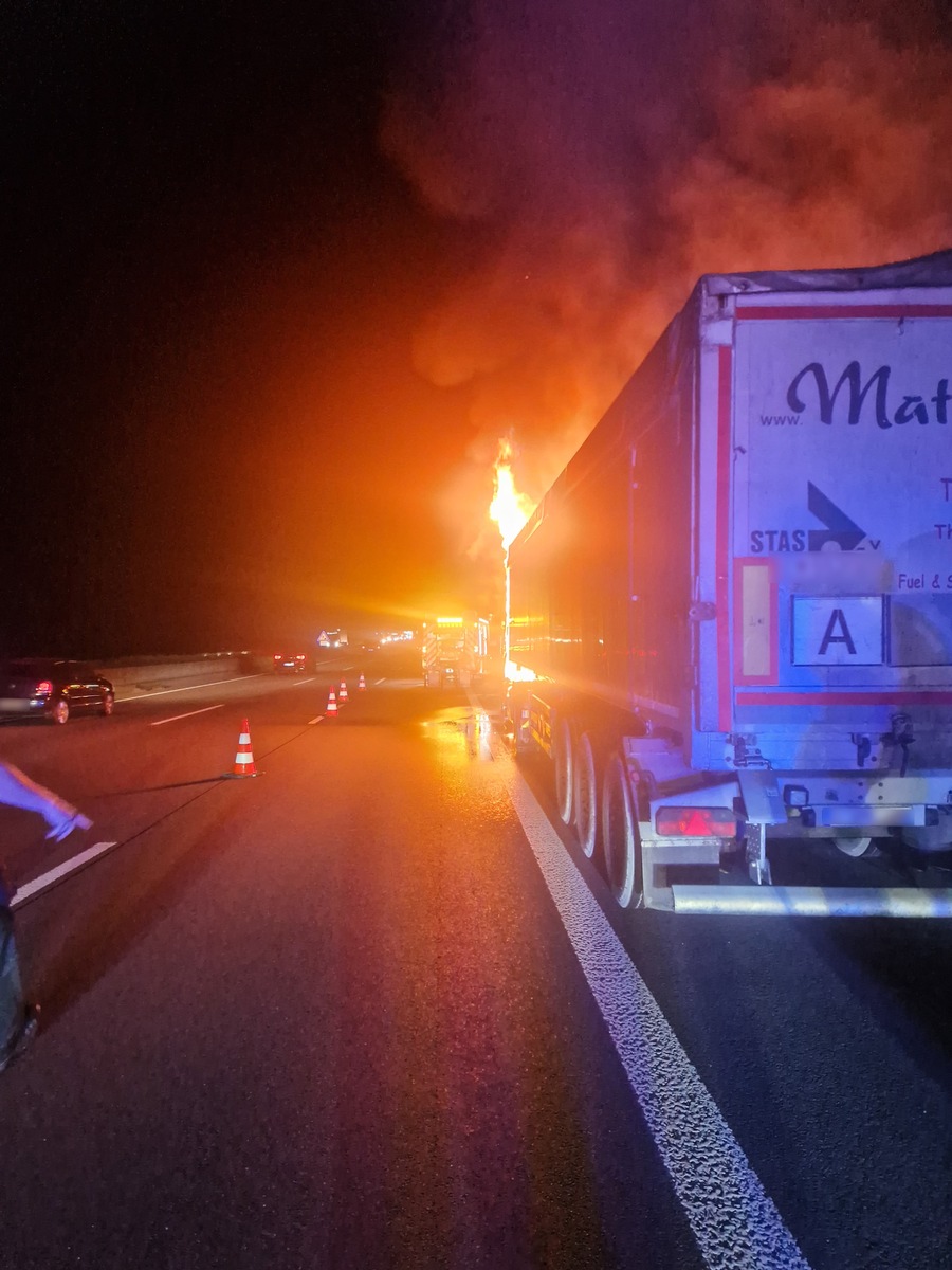 Sofort positionierten die Einsatzkräfte die beiden Löschfahrzeuge vor und hinter dem Lkw und leiteten einen Löschangriff über zwei C-Rohre mittels Schnellangriff ein. Die Brandbekämpfung zeigte zügig Wirkung - das Feuer wurde eingedämmt und ein Übergreifen auf den Auflieger verhindert, wodurch größerer Schaden abgewendet wurde. Zusätzlich wurde Schaum eingesetzt, um ein Wiederaufflammen zu verhindern.