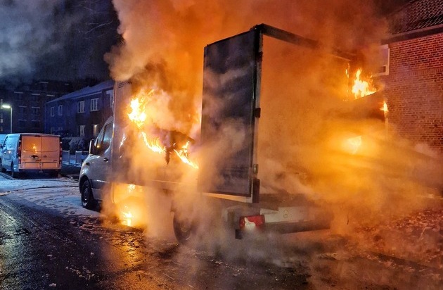 Am frühen Morgen des 06.01.2025 wurde die Feuerwehr Neuss um 06:37 Uhr zu einem brennenden Kleinlaster auf der Straße Im Hexfeld im Stadtteil Weissenberg alarmiert.