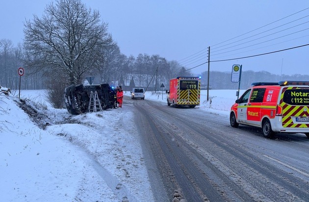FR / Bielefeld / Jöllenbeck - Am Donnerstagmorgen, 29.01.2026, verlor ein Autofahrer auf der winterglatten Fahrbahn die Kontrolle über sein Auto. Das Fahrzeug kippt auf die Seite. Ein Insasse wurde leicht verletzt.