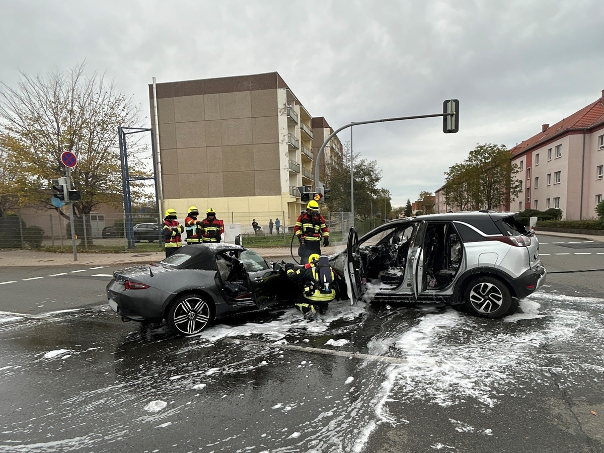 Ein 34jähriger Mazda-Fahrer befuhr die Rudislebener Allee aus Richtung Ichtershausen kommend und wollte links in die Straße Am Lützer Feld einbiegen. Er übersah die entgegenkommende und zugleich vorfahrtsberechtigte 75jährige Fahrerin eines Pkw Opel und es kam zur Kollision. Hierbei wurden beide Fahrzeuge massiv beschädigt. Zudem wurde die Opel-Fahrerin durch die Energieentfaltung schwer verletzt und später in ein Krankenhaus verbracht. Vermutlich aufgrund der Motorhitze in Verbindung mit austretenden Betriebsstoffen der Fahrzeuge mit Verbrennungsmotor fingen die Fahrzeugswracks Feuer. Dieses konnte durch die Freiwillige Feuerwehr Arnstadt gelöscht werden. Beide Fahrzeugen erlitten Totalschäden in Gesamthöhe von etwa 45.000,- Euro. Zudem wurde durch die Hitzeentwicklung die Fahrbahndecke beschädigt, was mit derzeit 9.000,-EUR beziffert wird.