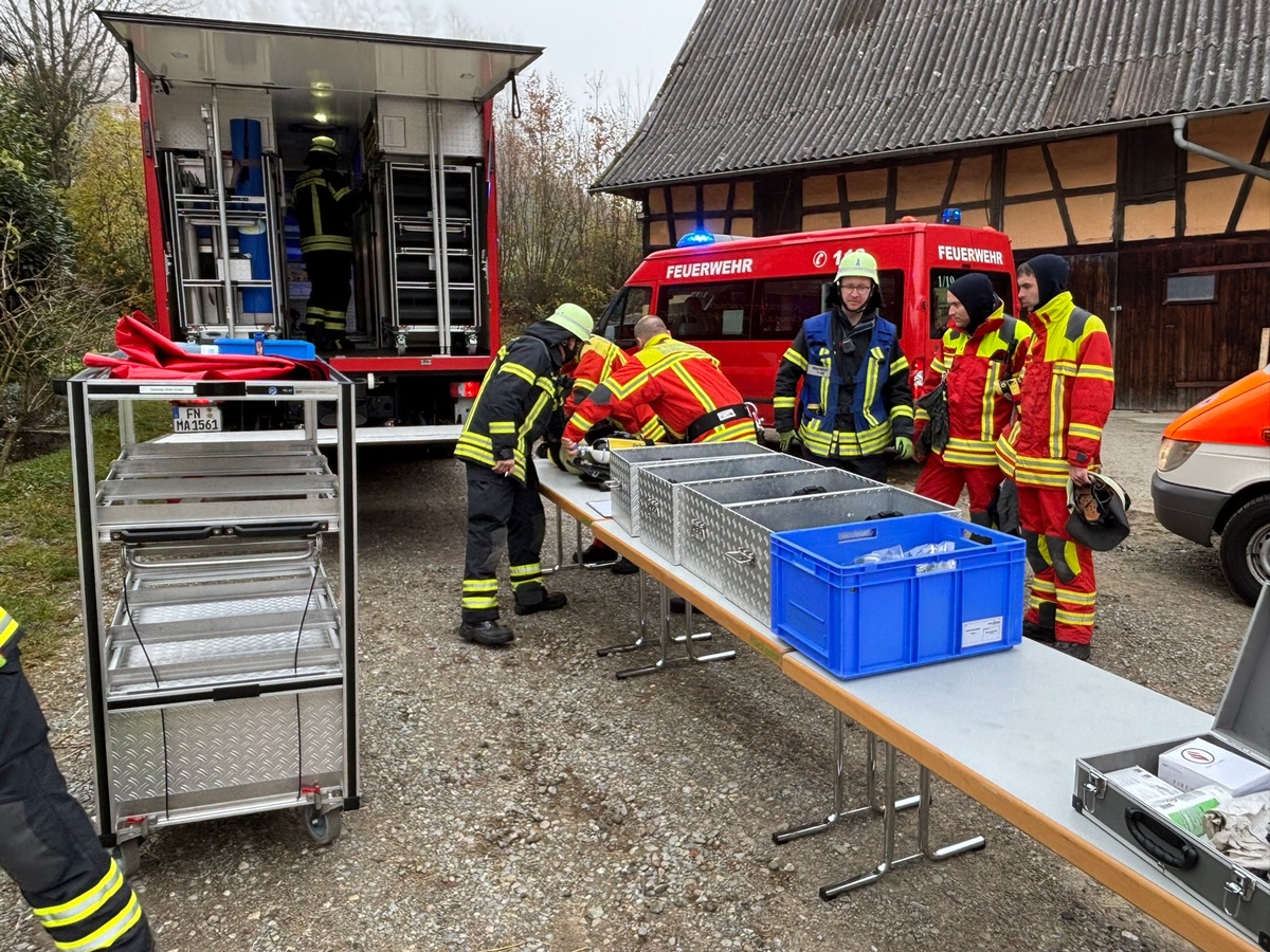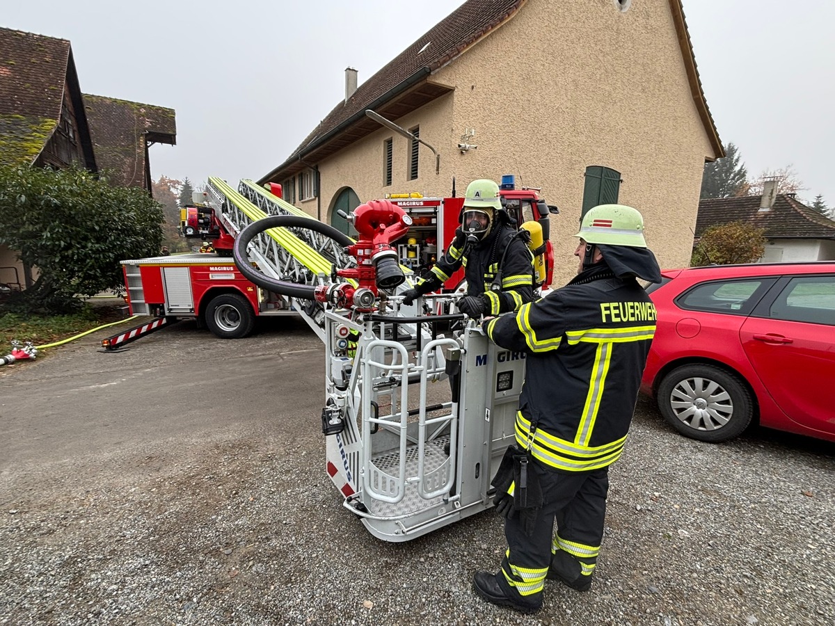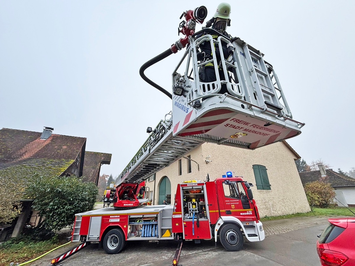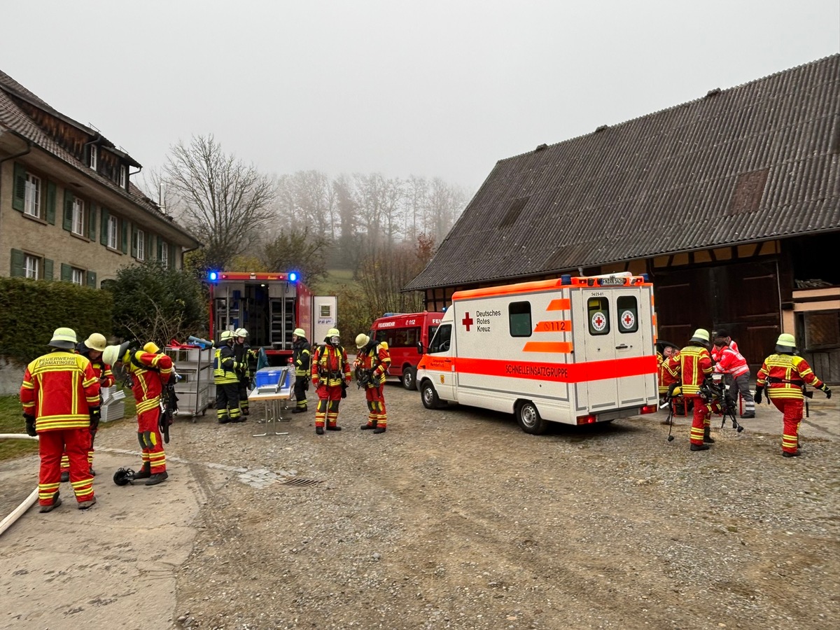Am Freitagmittag (7.11.2025) kam es im abseits gelegenen Hofgut Wiggenweiler (Gemeinde Bermatingen, Bodenseekreis) zu einem größeren Feuerwehreinsatz. Um 12.31 Uhr wurden die Feuerwehr Bermatingen und die Drehleiter aus Markdorf wegen eines mutmasslichen Kaminbrands in einem Gebäude in Wiggenweiler alarmiert. Vor Ort war auch eine Rauchentwicklung und deutlich Brandgeruch wahrnehmbar. Die Erinnerungen an den Großbrand auf dem Hofgut im August 2013 kamen wieder auf. Die Einsatzkräfte bauten einen Löschangriff auf und prüften die Kaminanlage in dem mehrere Hundert Jahre alten Gebäude, auch von der Drehleiter aus. Zur Verstärkung wurden weitere Kräfte aus den Feuerwehren Markdorf und Deggenhausertal mit jeweils einem Löschfahrzeug angefordert. Der Gerätewagen Atemschutz/Strahlenschutz aus Markdorf war ebenfalls nachalarmiert worden. Der hinzugezogene Schornsteinfeger konnte allerdings keinen Brand im Kamin feststellen. Die weiteren Nachforschung in dem Haus, das teilweise bewohnt war, ergaben, dass es sich um einen Kabelbrand in den Wänden handeln musste. Nach dem aufwändigen Öffnen der Wand- und Deckenverkleidungen konnten auch Spuren von Brandzerung festgestellt werden. Diese Maßnahmen und das Herunterkühlen der betroffenen Stellen in dem stromlos geschalteten Gebäude verhinderten eine Brandausbreitung. Gegen Nachmittag konnte der Einsatz der Feuerwehr beendet werden. Zur Sicherheit blieb eine Brandwache bis zum Abend vor Ort. Mit im Einsatz war der Rettungsdienst und die DRK-Schnelleinsatzgruppe aus Markdorf, die die medizinische Überwachung der eingesetzten Atemschutzgeräteträger übernahm. Verletzt wurden bei dem Einsatz niemand. Die genaue Brandursache, sowie die Schadenshöhe ist Gegenstand polizeilicher Ermittlungen. Im Einsatz war die Feuerwehr mit 43 Kräften und 9 Fahrzeugen.