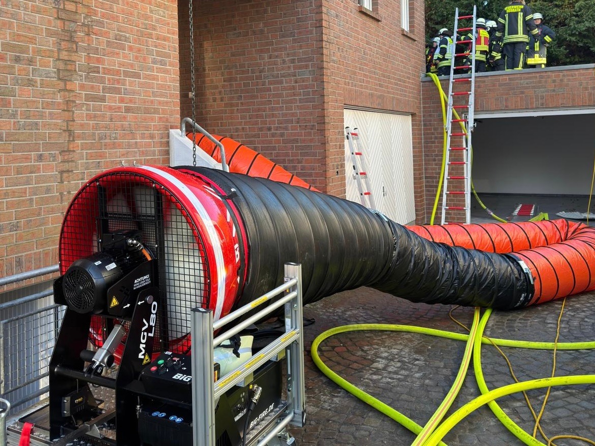 Parallel wurde eine Öffnung des Daches mit einer Rettungssäge durchgeführt, um eine Abluftöffnung zu schaffen. Erstmalig kam der neue mobile Großventilator zur Belüftung zum Einsatz, mit dem umfangreiche Lüftungsmaßnahmen durchgeführt wurden.